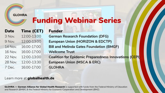 The aim of this Funding Webinar Series is to facilitate connections between researchers and key funders in the global health space. We encourage GLOHRA members as well as researchers from the extended community to join this series to gain better insights into funding programs and opportunities available to global health researchers.