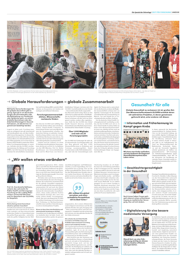 We are delighted to share that GLOHRA is featured in an advertorial in DIE ZEIT, Germany’s largest weekly newspaper. The piece highlights GLOHRA's mission to tackle today’s global health challenges via interdisciplinary and collaborative research. While GLOHRA activities cover a diverse range of topics – from the early detection of cancer to gender equality in health and digital approaches in medicine – they share a dedication to innovative, interdisciplinary research built on equitable, international partnerships.